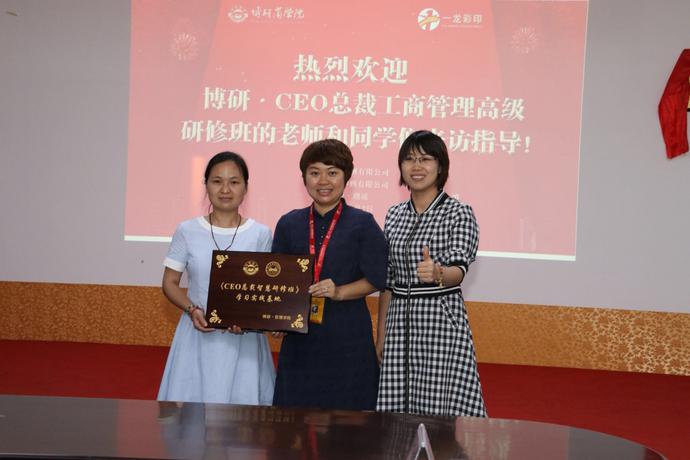 現代化廠區參觀后,參訪團來到一龍彩印公司總部辦公樓三樓大會議室進行分享交流活動,活動由博研教育商學院CEO總裁班陳日榮老師主持。交流期間,一龍印刷企業總經理何總(也是博研教育金哲班在讀同學)、石總分別分享自己的職業生涯、創業歷程!此外博研教育帶隊老師及眾多來訪同學們也有序做了自我介紹,隨后博研教育商學院陳日榮老師代表學院,向一龍印刷企業授予并頒發了《CEO總裁智慧研修班》學習實踐基地匾牌。